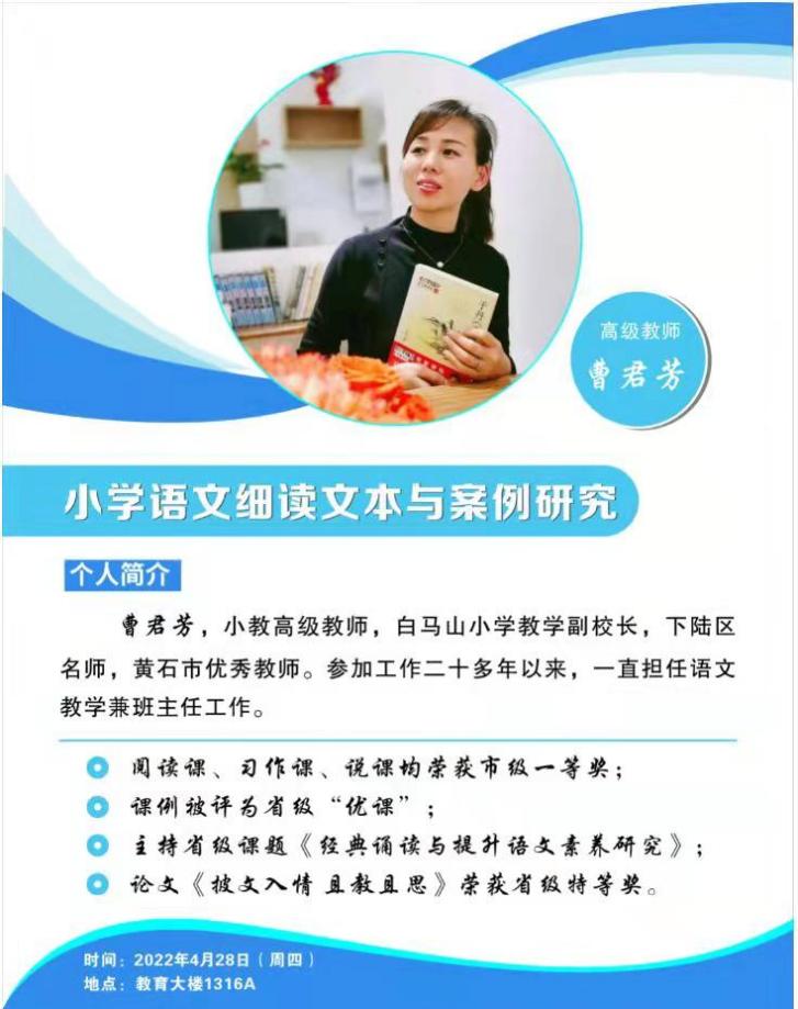 2022年4月28日下午,白马山小学副校长曹君芳在教育大楼1J12举行《小学语文细读文本与案例研究》讲座。本次讲座由崔波副院长主持。