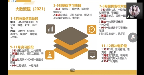 活动伊始,秦姗姗老师向同学们介绍了会议目的,四位考研成功的同学先后进行了经验分享。首先是已考取浙江师范大学教育学学术性研究生的陈晨,陈晨同学从政治、英语、教育学专业基础综合三个方面展开了自己的经验分享;随后是考取西南大学基础心理学研究生的丁汝,丁汝同学着重介绍了公共课与专业课复习的网课、资料与时间的合理安排;接着是考取华南师范大学小学教育专业研究生的曹芹芹,曹芹芹同学从专业简介、考研初心、考研历程、上岸心得四个方面分享了自己的宝贵经验,详细地介绍了学习英语的方法,并给出了实用的小建议;最后是考取中南民族大学心理健康教育专业研究生的蔡文静,蔡文静同学用结构图的形式直观地展现了择校、网课选择、时间管理三方面的内容,让参会的同学们清楚明晰地了解到相关方面的知识。经验分享结束后,参加线上会议的同学们对于考研提出了自己的疑惑,如怎样平衡实习与考研等等,四位同学针对不同的问题做出了相应的解答。最后,秦姗姗老师总结道,考研的同学应当未雨绸缪,利用好碎片化时间做好复习工作,同时祝愿同学们都能成功上岸。至此,本次会议圆满结束。