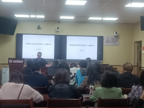 首先,涂艳国教授简要介绍了教育硕士专业学位的发展历程以及四种类型的教育硕士研究生。其次,涂教授结合培养教育硕士研究生的实际情况,从教育硕士专业下的方向、规模、人才培养方案等方面重点讲解教育硕士研究生培养的关键环节,强调培养目标、招生对象、学习年限、课程设置、培养方式、实践教学的实施、学位论文及学位授予的重要性。最后,涂教授再次强调要抓住教育硕士研究生培养的关键环节,把好硕士论文选题关,重视实践教学。