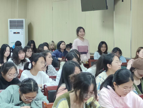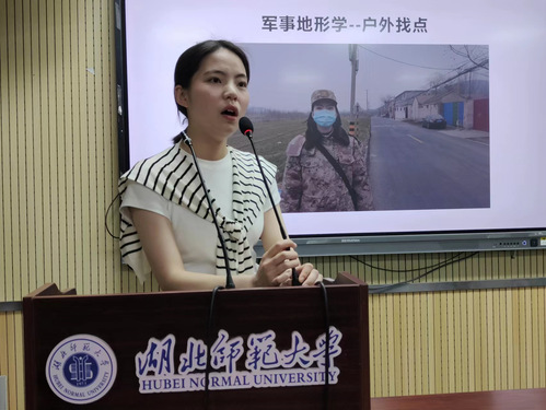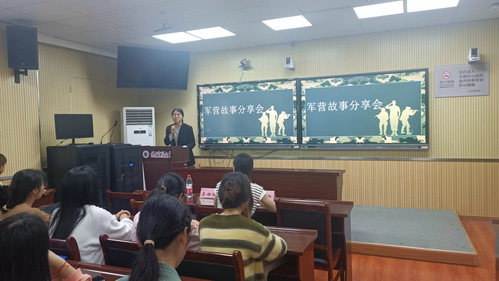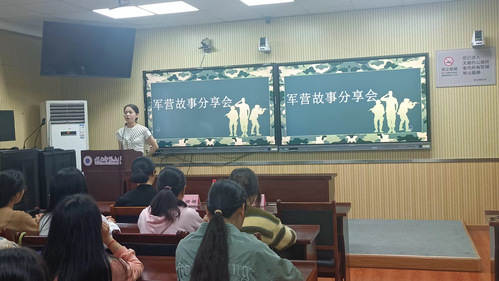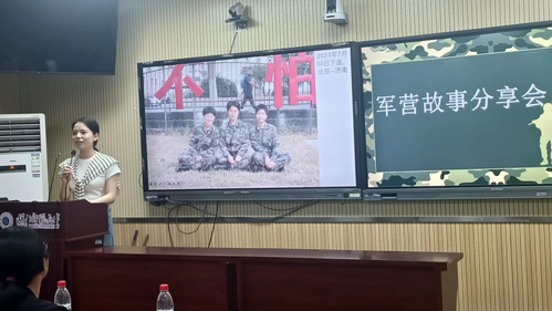 接着,退役返学的李湘湘学姐上台进行自我介绍,并分享了她军旅生活中的小故事,同时学姐还向大家介绍了退役地区的特色景区。学姐对军营中的生活,训练以及工作细节等的详细阐述,让同学们对军营生活有了更深入的了解。