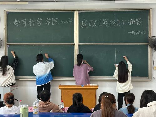 为了进一步加强党章党纪和国家监察法律法规宣传教育,切实提升大学生书写能力和书写规范。教育科学学院学生会学习部于10月23日中午12:30在教育大楼1j31举行了廉洁主题粉笔字初赛。参加本次活动的有各位评委及全体参赛人员。