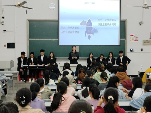 为了进一步加强学生安全教育和管理工作,教育引导学生牢固树立安全第一责任人意识,自觉养成安全行为习惯,教育科学学院联合经济管理与法学院与于10月23日晚七点在科技大楼9105教室开展安全主题辩论赛活动。参与本次活动的有参赛评委、教育科学学院辩论队员、校园安全部部长和见习干事以及观众。
