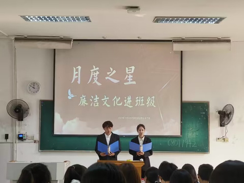 活动伊始,主持人赖家宜和罗启恒为大家介绍本次活动主题和比赛规则,并对各位嘉宾、观众的到来表示欢迎。接着各位参赛选手围绕“廉洁文化进班级”主题进行了精彩绝伦的演讲,分享了他们对廉洁文化的认识和理解,同时也呼吁大家崇尚廉洁文化。之后由四位评委根据评分标准进行现场打分。最后金依对此次演讲比赛进行总结发言,主持人根据打分情况宣布获得一等奖的人员为苏蔚楠、唐慧茹,金依和岳柳为其颁发奖状。