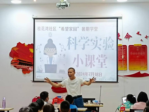 《3-6岁儿童学习与发展指南》指出:幼儿科学学习的核心是激发探究兴趣,体验探究过程,发展初步的探究能力。每个孩子对自然界的奇观满怀好奇与敬畏。因此在这个充满活力的暑期,教育科学学院小螺号实践队携手桂花湾社区党群服务中心,共同开启了一场别开生面的科学探索之旅。开展了一堂以“科学实验小课堂,助力儿童大成长”为主题的趣味科学实验课,不仅点燃了同学们的科学好奇心,更激发了探索未知的热情。