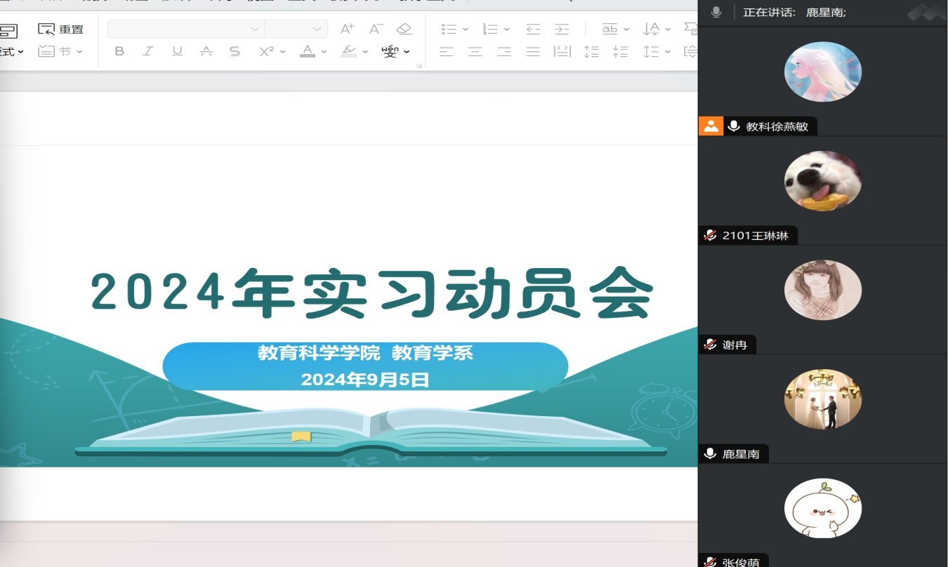 为了让同学们更加积极地参与即将到来的教育实习,并对其过程有一个全面而深入的了解,教育科学学院教育学专业2101班于2024958:309:30,通过腾讯会议平台成功举办了一场线上教育实习动员大会。教育科学学院教育学系主任鹿星南2101班班主任徐燕敏及教育学系部分教师参加此次会议,旨在激发学生们的热情,确保他们对实习的每个环节都有清晰的认识和准备。