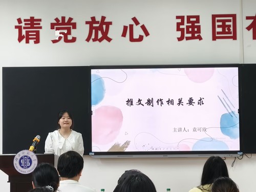 接着,青年传媒中心前任部长耿安逸及袁可欣分别就通讯稿及推文相关工作展开详细讲解,强调各部分的写作要点,指出要注重事实的准确性和语言的简洁,要求部长们注意投稿时间,按时完成投稿
