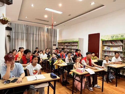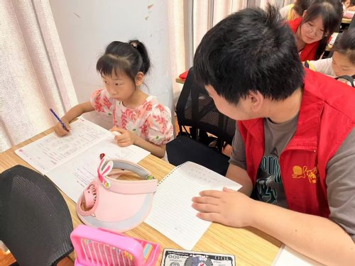 开班典礼结束后,开始正式上课,实践队员们化身“小老师”,全身心投入暑假作业辅导中。孩子们纷纷拿出语文、数学、英语等暑期作业,也有少部分的小朋友选择字帖练习或课外读物阅读。托管班涵盖一至八年级学生,队员们根据不同年龄段特点因材施教——针对低年级孩子识字量有限的问题,他们手持草稿纸示范书写,细致讲解汉字的含义与用法。对于中高年级学生,则为其提供个性化作业辅导,确保每个孩子都能得到适宜的学业指导。