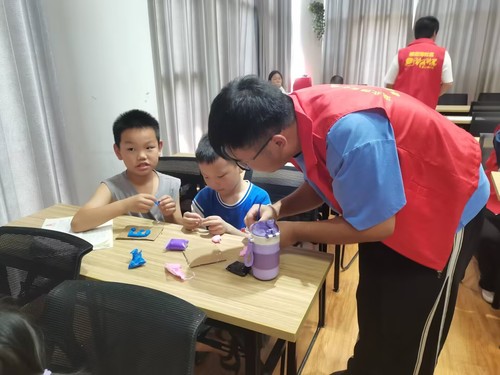最后,冉诗晴让小朋友们用粘土在纸板上创作甲骨文,实践队队员在旁进行指导协助。孩子们积极展示自己的作品,活动还评选出优秀作品进行展示,进一步激发小朋友们对文字学习的兴趣。