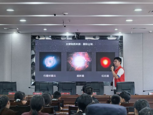 下午,夏令营特色课程有序开展。实践队队员杨浩禺主讲《太阳与地球》,课程以趣味实验为切入点,配合生动讲解,引导小营员系统探索宇宙奥秘。课堂上,从太阳发光发热的科学原理,到地球公转自转与四季更迭、昼夜交替的关联,杨浩禺通过模型演示、互动问答等方式,将抽象知识具象化。小营员们专注投入,不时举手提出疑问,在思考与交流中深化对天文知识的理解。