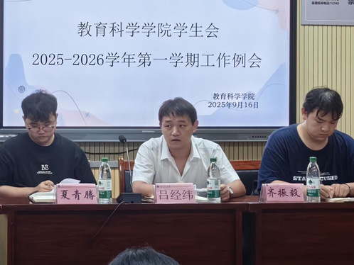 为明确今后工作方向,促进各部门的发展和进步,教育科学学院于9月16日中午在教育大楼1316A召开学生会2025-2026学年第一学期工作例会。本次与会人员有辅导员夏青腾、吕经纬老师及学生会全体中心组成员。